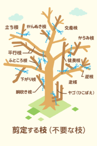 枝同士がぶつかって傷みやすく、病害虫の原因にも。どちらかを残し、スッキリ整理。