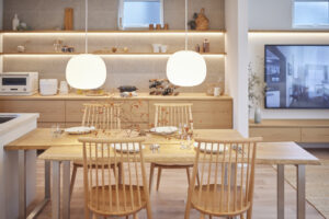 キッチンスタジオはナチュラルテイストな空間ですが、モダンなインテリアにも、和な雰囲気にも調和します。手作りの技術によって生まれた美しい光をぜひご覧下さい。
