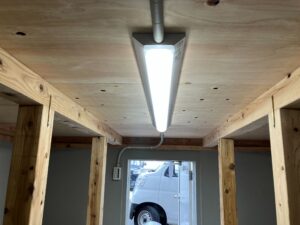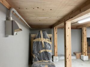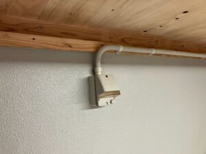 「露出配管」とは、壁の中に埋め込まず、あえて表面に出して配管を通す方法のことです。電気の配線を、壁や天井の上に見える形で設置します。